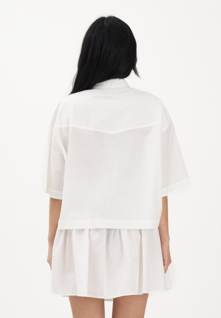 Camicia cropped PINKO con ampie maniche corte, realizzata in popeline di puro cotone dalla mano fresca e piacevole. Questo modello, perfetto per completare con originalità gli outfit da giorno o per creare look serali freschi e rilassati, è impreziosito da dettagli curati che rispecchiano il carattere PINKO: una stampa all-over di ispirazione floreale e due applicazioni metalliche in stile western finemente decorate sulle punte del colletto. La chiusura nascosta con solo il primo bottone visibile completa il capo.
