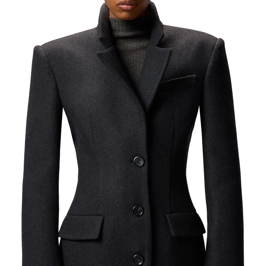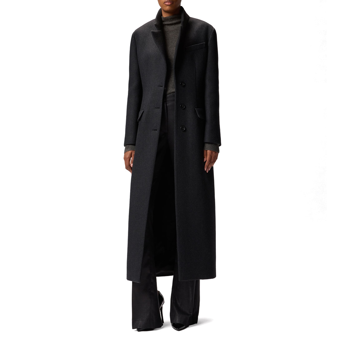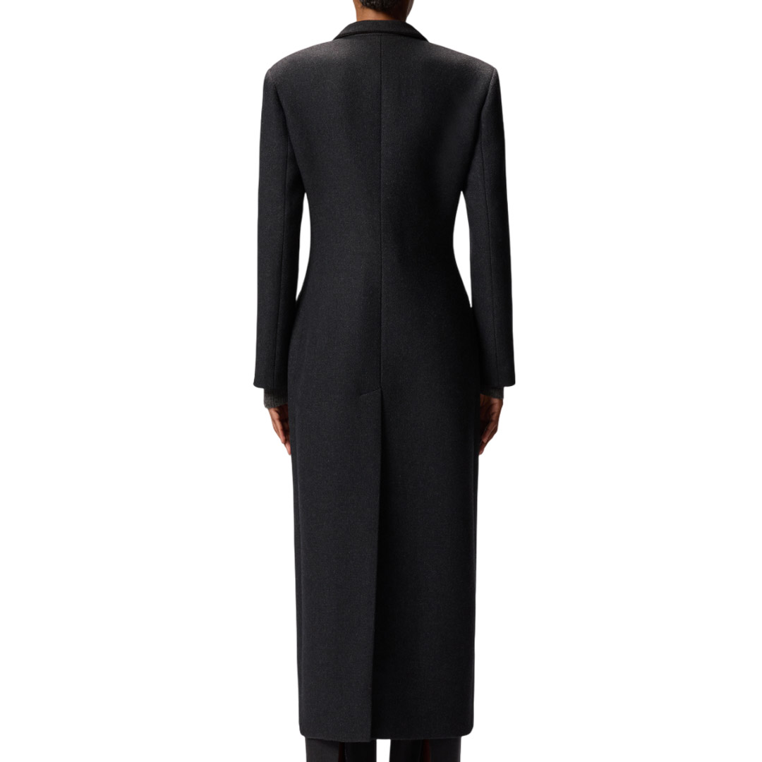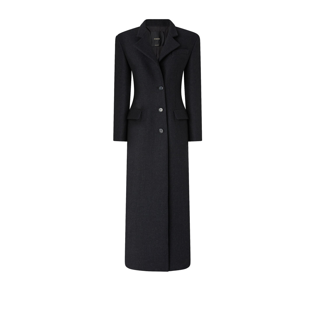 Cappotto lungo monopetto dalla linea sfiancata con collo a revers, spalle strutturate e tasche con patta, realizzato in morbido panno di misto lana. Il lungo taglio asimmetrico sul retro e l'abbottonatura decentrata sul davanti contribuiscono a rivisitare un design classico, dando come risultato un modello essenziale ma di classe in pieno stile PINKO, destinato a diventare un nuovo must della stagione fredda.