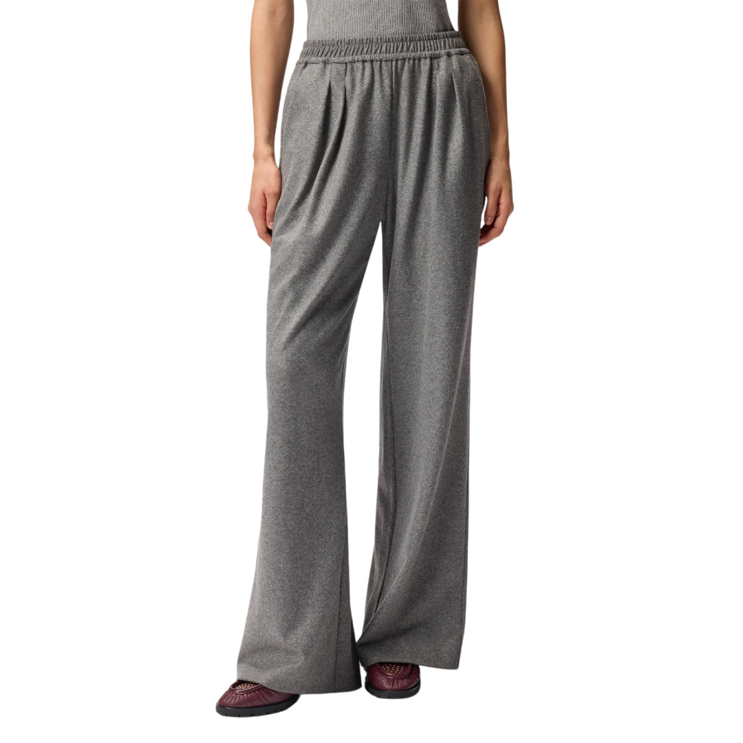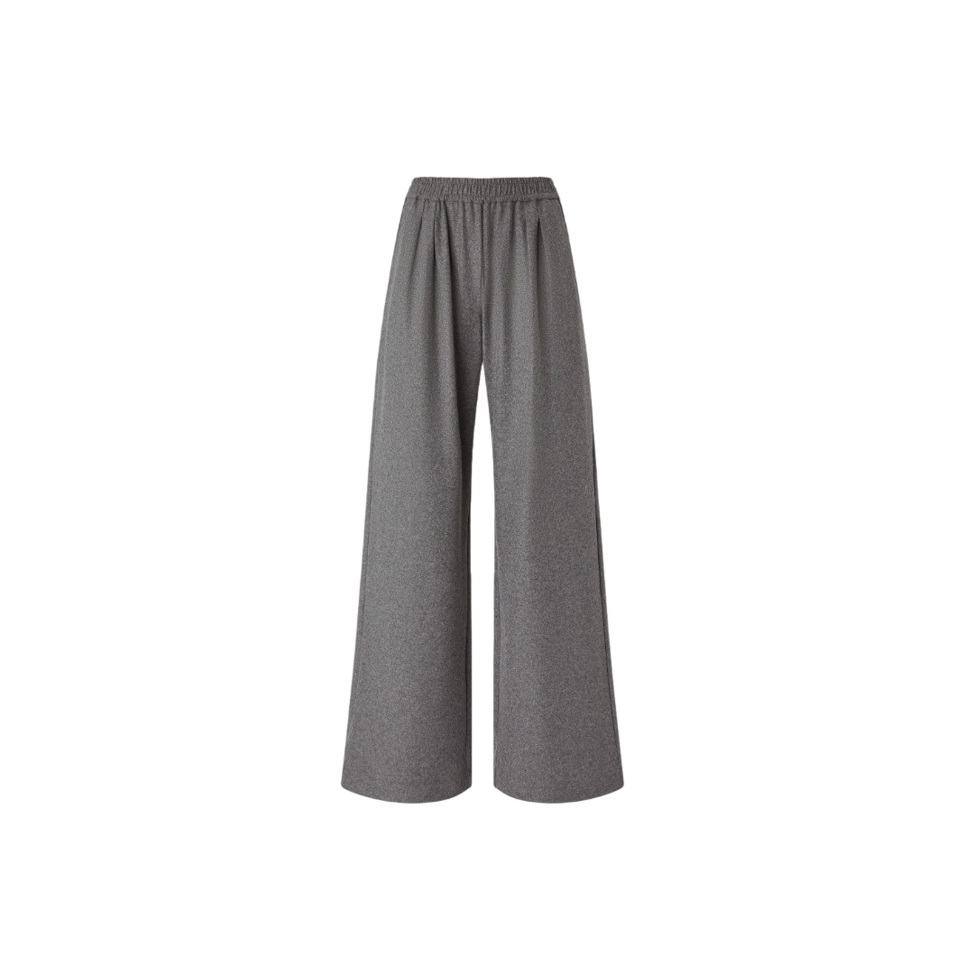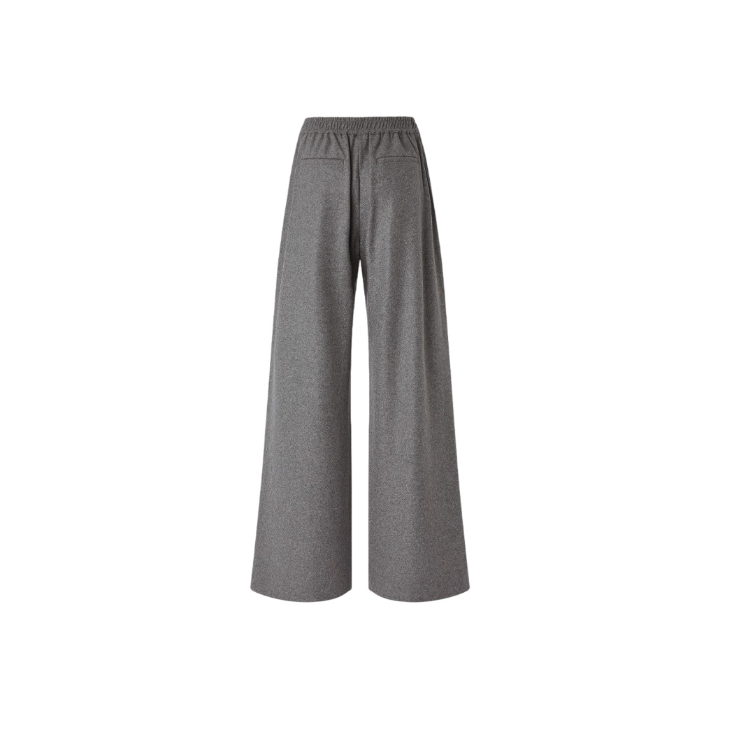 Pantaloni lunghi realizzati in flanella di jersey di misto lana tinto in filo, un tessuto perfetto per combinare morbidezza, elasticità e comfort, e caratterizzati da una linea wide-leg con gamba svasata al fondo. Il modello risulta comodo e funzionale grazie alla vita elasticizzata, ma inserisce un rimando allo stile sartoriale con un accenno di plissettatura sul davanti e con le discrete tasche a filetto sul retro. I pantaloni a gamba ampia sono i nuovi must-have dei look formali ed eleganti, sia per look spezzati che per un nuovo concetto di tailleur.