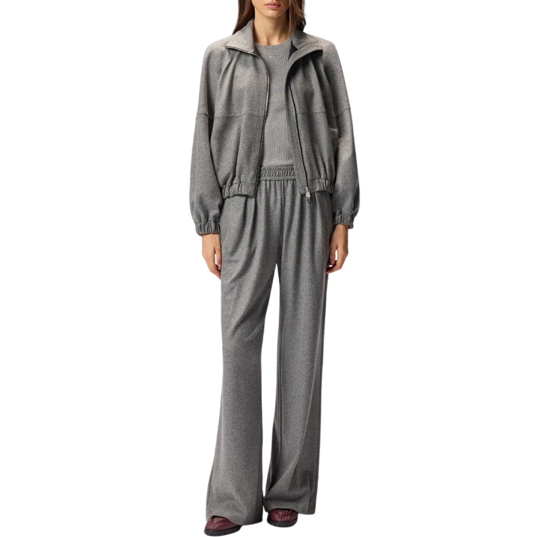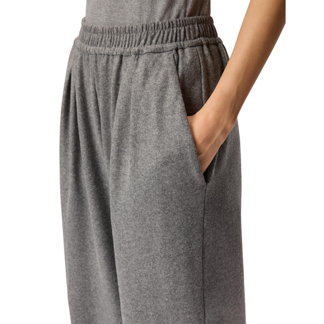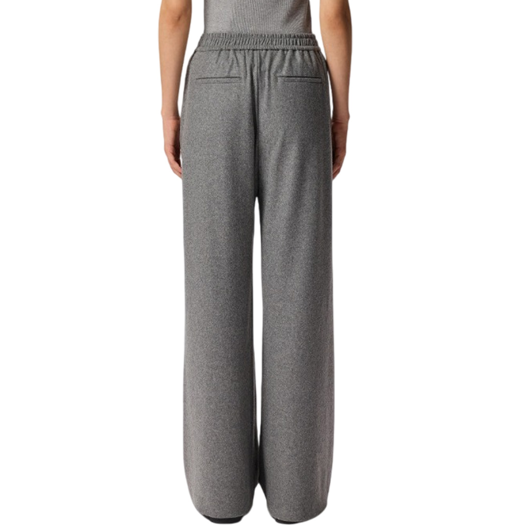 Pantaloni lunghi realizzati in flanella di jersey di misto lana tinto in filo, un tessuto perfetto per combinare morbidezza, elasticità e comfort, e caratterizzati da una linea wide-leg con gamba svasata al fondo. Il modello risulta comodo e funzionale grazie alla vita elasticizzata, ma inserisce un rimando allo stile sartoriale con un accenno di plissettatura sul davanti e con le discrete tasche a filetto sul retro. I pantaloni a gamba ampia sono i nuovi must-have dei look formali ed eleganti, sia per look spezzati che per un nuovo concetto di tailleur.