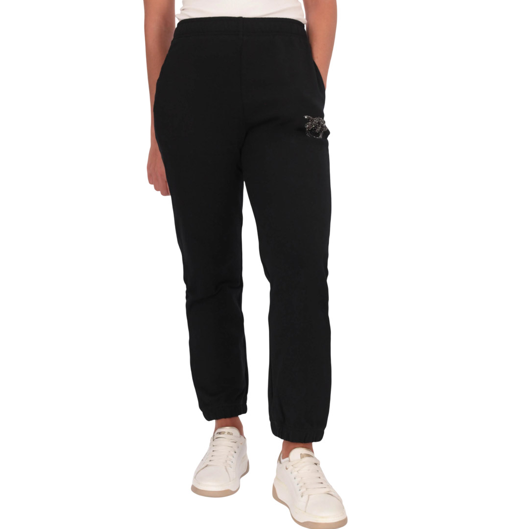 Il pantalone è realizzato in cotone, con logo sul lato con applicazione di strass. Presenta elastico in vita, con tasche a filetto ed elastico sul fondo.