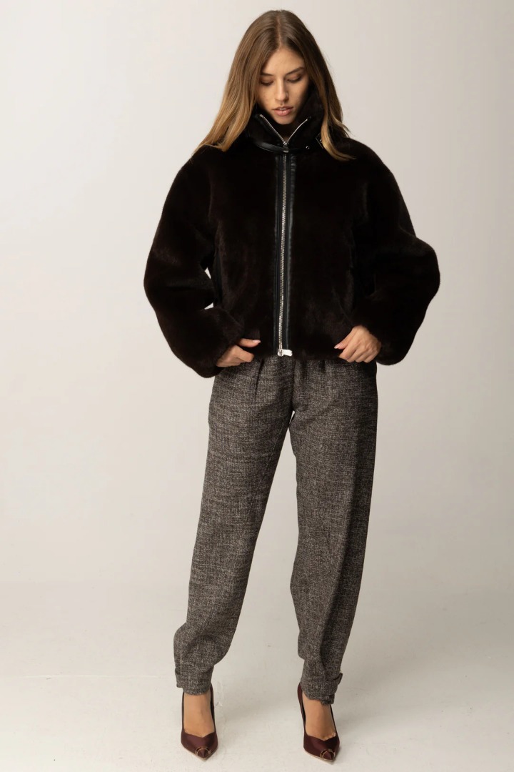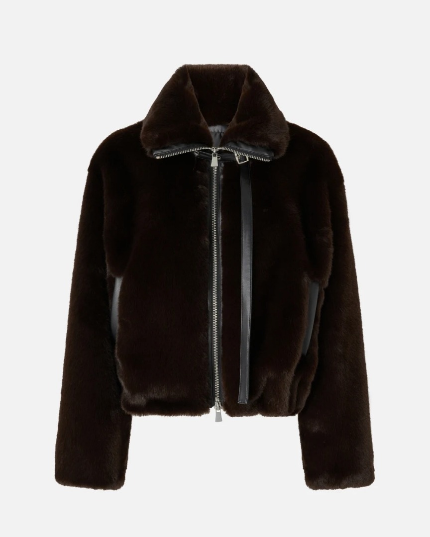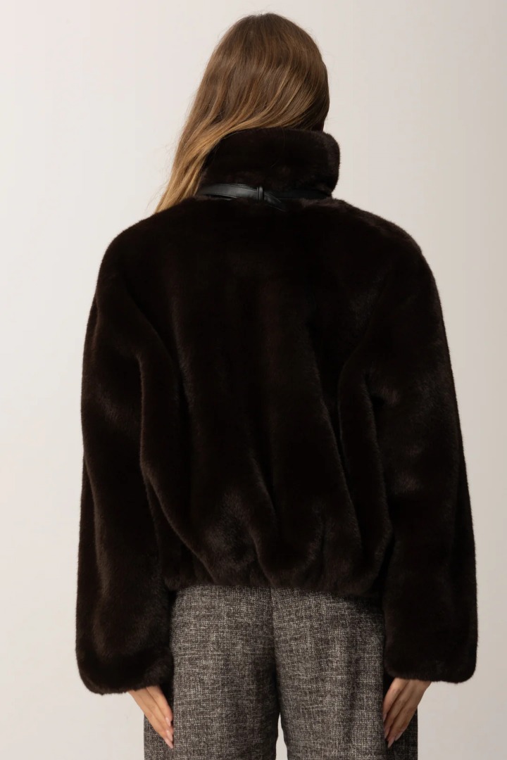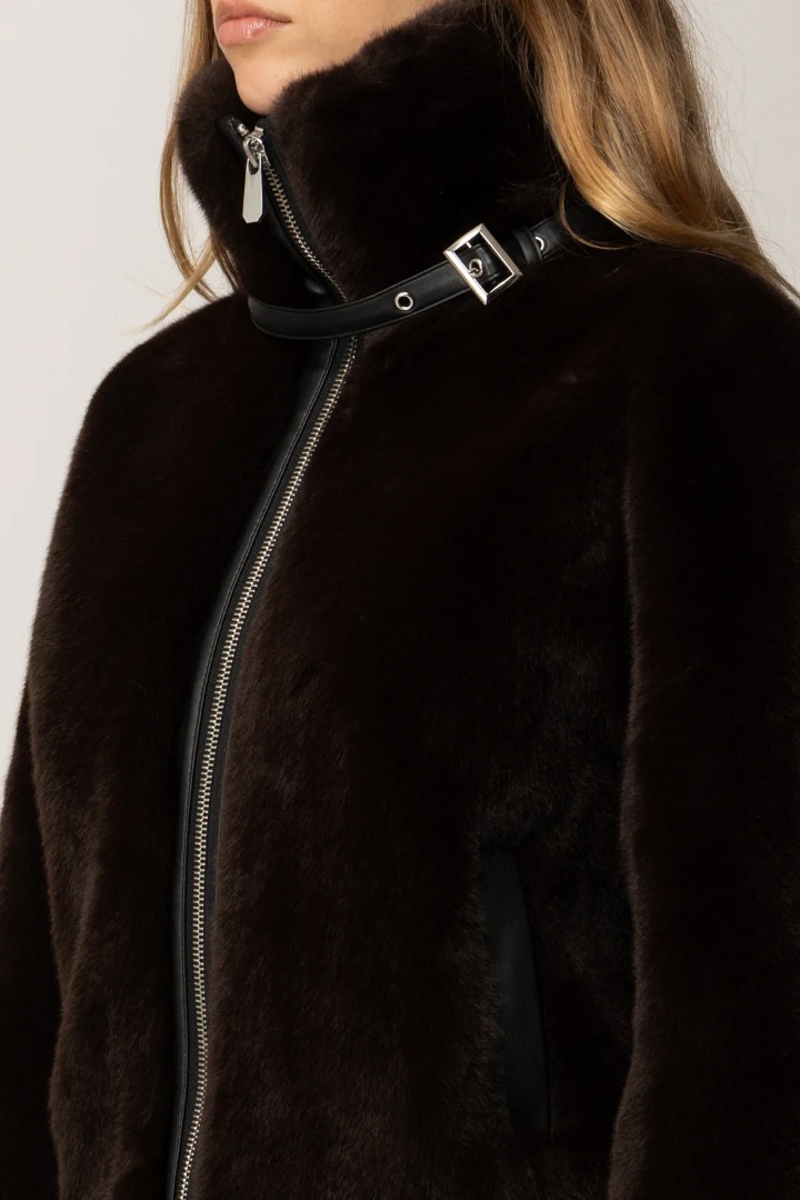 Giacca blouson realizzata in tessuto Aspen effetto pelliccia, con chiusura con zip a tutta lunghezza, un collo alto morbido e l'orlo con arricciatura. Il tessuto spalmato effetto pelle che profila le tasche, la chiusura e il cinturino con piccola fibbia conferiscono al modello uno stile biker perfetto per la stagione fredda. Non aver paura di osare e aggiungi un tocco rock al tuo guardaroba casual.