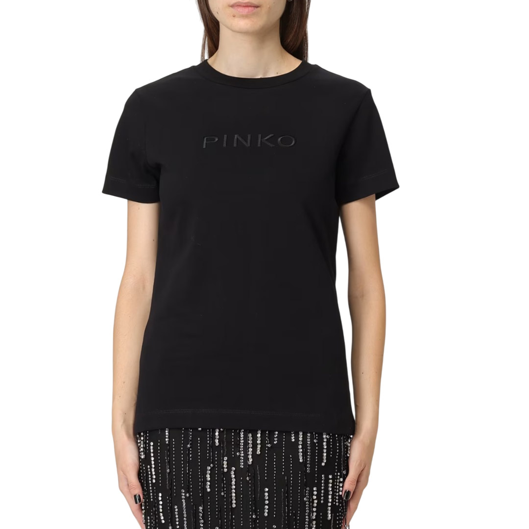 T-shirt a maniche corte dal taglio leggermente slim in jersey di cotone con ricamo logo PINKO davanti. Eleva l'eleganza e la femminilità di qualsiasi outfit grazie a questo top, che è il sottogiacca perfetto abbinato a pantaloni sartoriali, ma anche a un paio di jeans speciali.