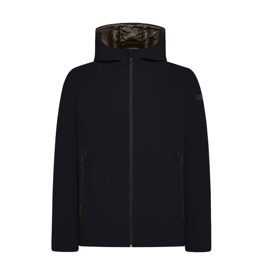 Il design modernissimo e minimalista ha reso questa giacca invernale, calda e resistente agli agenti atmosferici, un autentico instant classic di successo della Collezione. La raffinata costruzione in tessuto a membrana Stratofabric#3, traspirante e impermeabile, presenta l'esterno nell'esclusivo SURFLEX® elasticizzato. Alla leggerezza e al comfort della vestibilità regolare si aggiunge la protezione dalla pioggia e dal vento fornita dal cappuccio fisso. L'isolamento termico è garantito dall'imbottitura in calda e leggera piuma d'anatra 90/10, contenuta nei canali tubici che prevengono la fuoriuscita di piume. Il contrasto della chiusura frontale e le zip termonastrate delle ampie tasche laterali aggiungono una nota distintiva sul look super opaco. L'interno è dotato del taschino chiuso da zip invisibile e ravvivato dal doppio filetto arancione fluo. La tag a cuore "Made with love, designed in Tuscany" e il logo a microiniezione nero sulla manica sinistra sono le note di stile inconfondibile di questo capospalla dal forte dinamismo urban