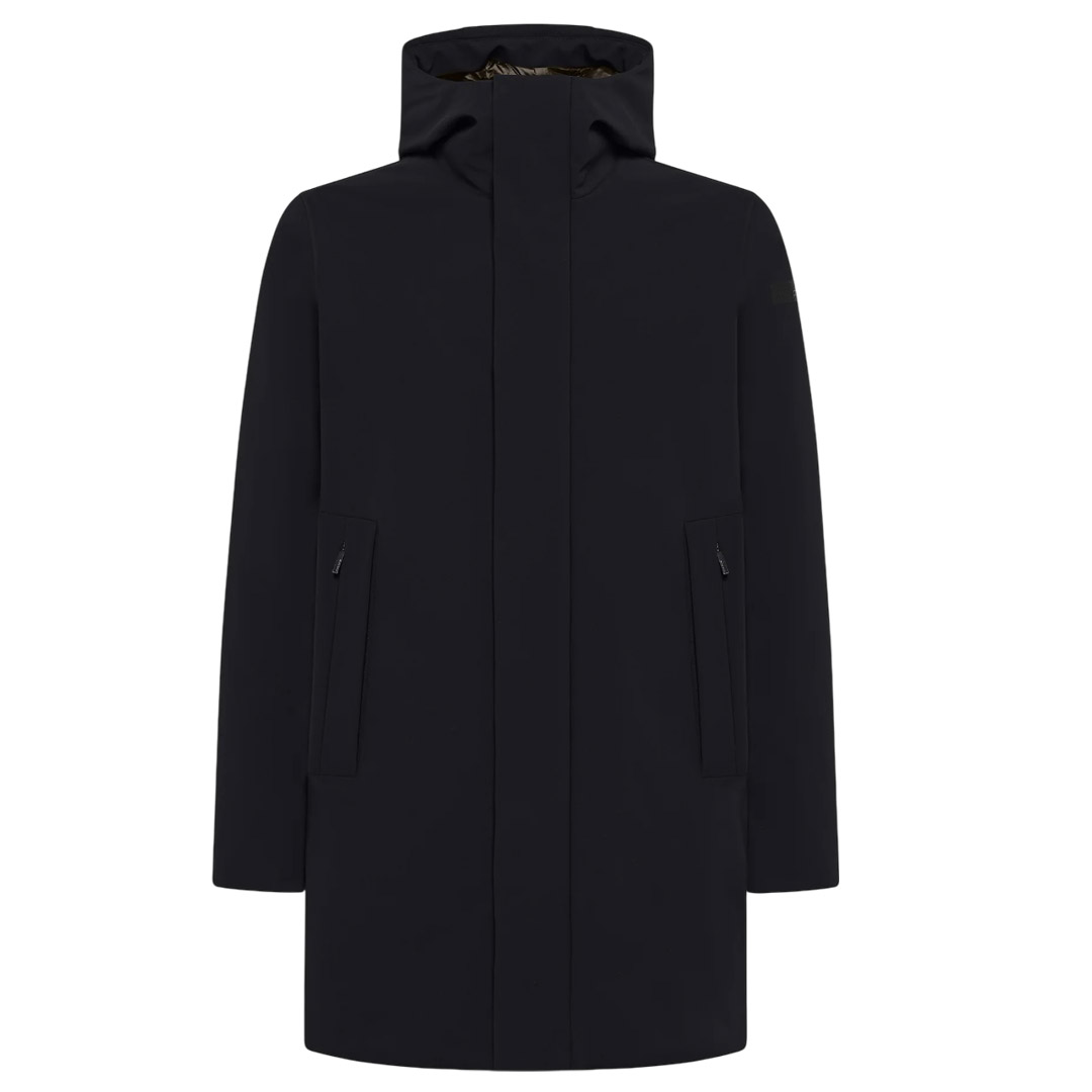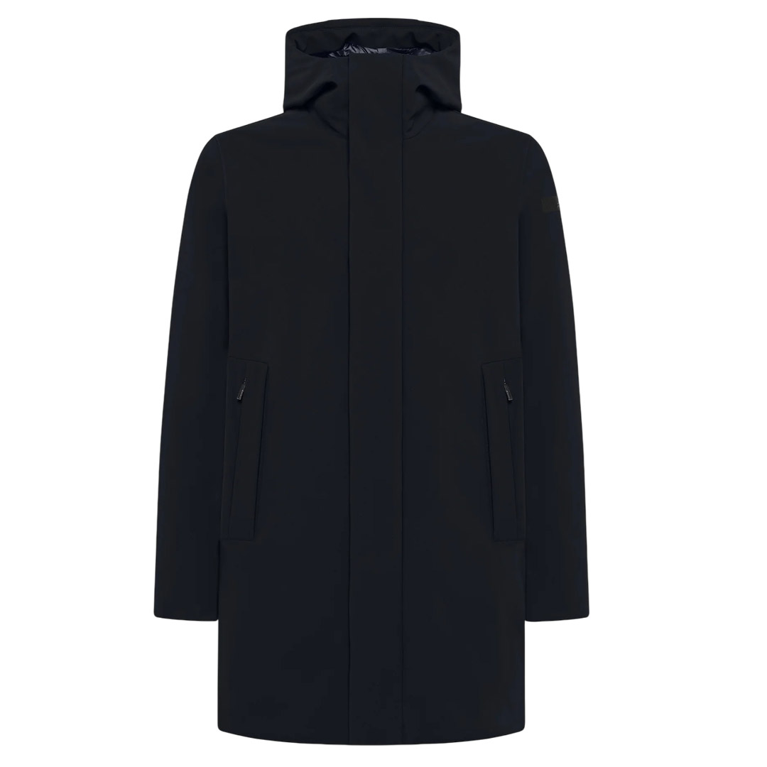 L'intramontabile design eskimo si trasforma in un capospalla prezioso, hi-tech e minimalista, che garantisce un alto livello di protezione dal freddo e dalle intemperie. Il modello leggero e confortevole è dotato di cappuccio fisso imbottito e presenta la costruzione in tessuto a membrana Stratofabric#3, impermeabile e traspirante. Il look super opaco dell'esterno nell'esclusivo tessuto stretch SURFLEX® esalta la nitidezza del design. La patta a bottoni metallici nasconde la chiusura a zip con doppio cursore, affiancata dalle pratiche tasche laterali a pistagna e zip invisibile. Il calore è assicurato dalla morbida e leggera imbottitura in piuma d'anatra 90/10, contenuta nei canali tubici che prevengono la fuoriuscita di materiale. L'interno presenta due tasche interne. Il logo a microiniezione nero sulla manica sinistra firma il capospalla con una nota iconica.
