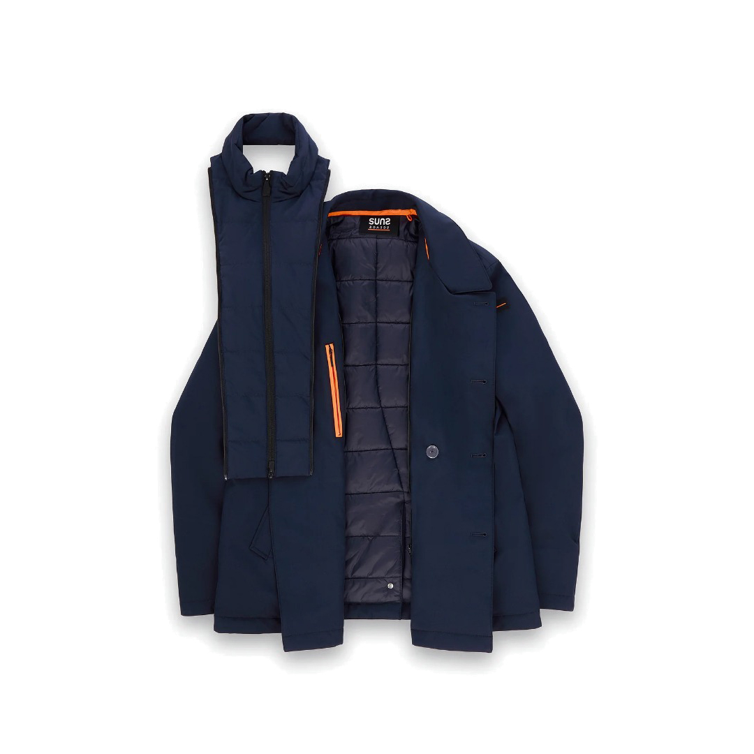 Un giubbotto uomo doppiopetto dal taglio classico reinterpretato in chiave tecnica. Il modello Coat Tech si distingue per il suo tessuto 4-way stretch con membrana TPU che garantisce protezione e flessibilità, mantenendo un’estetica pulita ed essenziale. L’imbottitura leggera in polyfil assicura il giusto comfort termico durante la stagione fredda. All’interno, la fodera trapuntata in nylon ton sur ton e il collo interno con zip aggiungono uno strato funzionale e protettivo. Doppiopetto con chiusura a bottoni: stile classico con linea moderna. Tessuto tecnico stretch con membrana TPU: flessibilità e protezione contro vento e freddo. Imbottitura leggera in polyfil: calore senza ingombro (120 gsm corpo / 100 gsm maniche). Fodera interna trapuntata: in nylon 380T tono su tono per comfort e isolamento termico. Polsini interni in lycra nera: per una vestibilità confortevole e antivento. Collo interno con zip: dettaglio pratico per maggiore protezione. Welt pocket senza zip: design pulito e funzionale. Finitura arancione: dettaglio distintivo Suns.