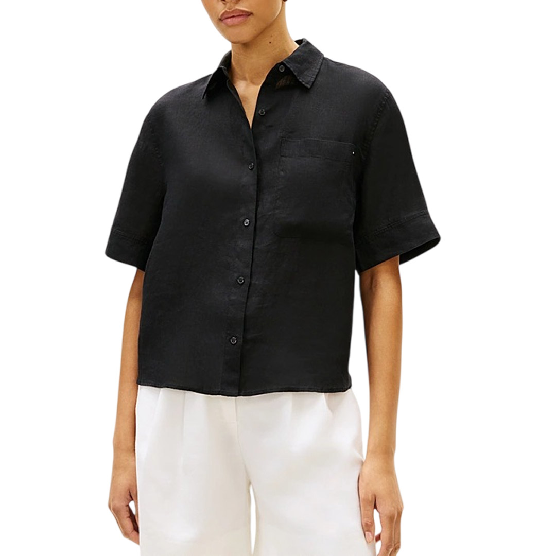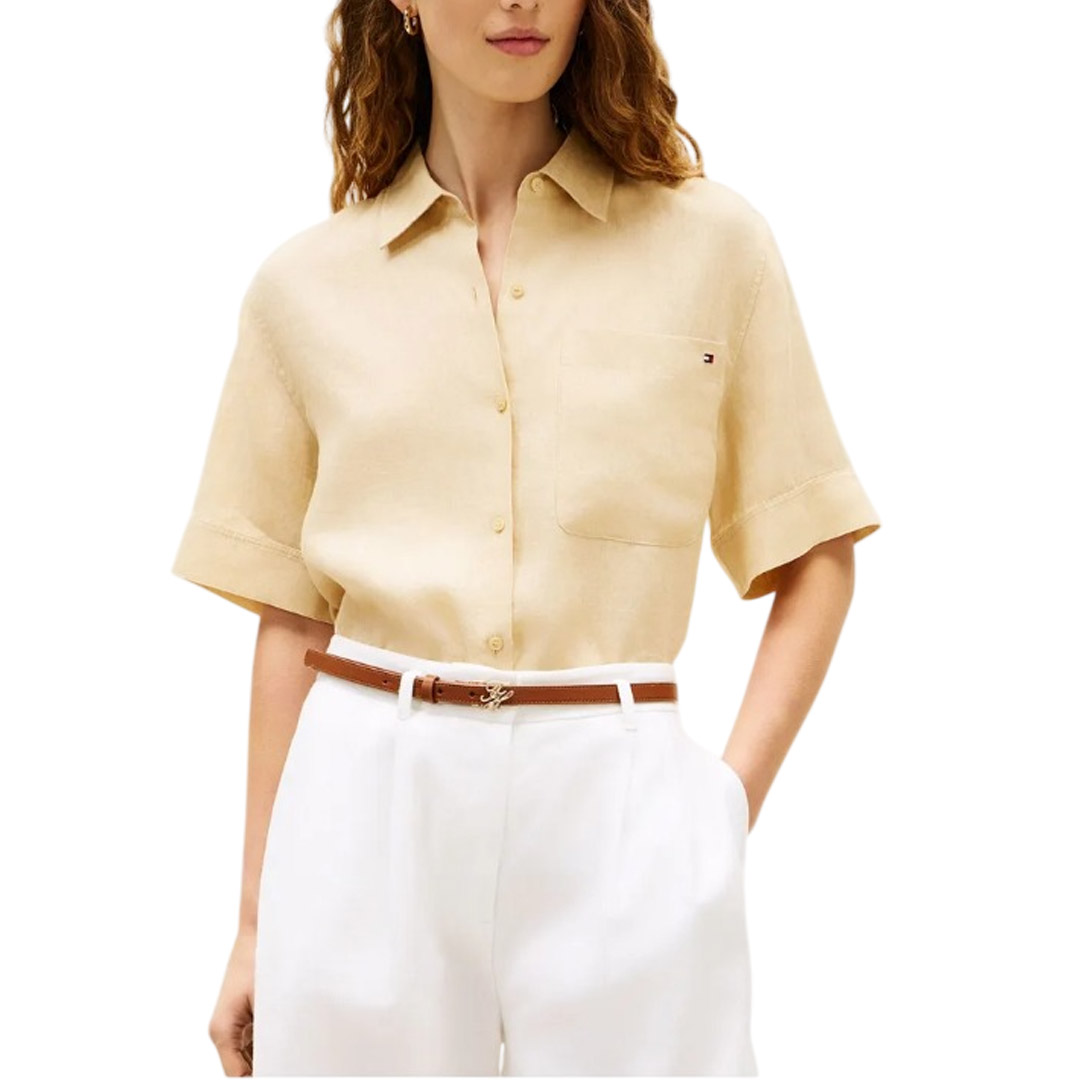 La camicia relaxed fit a maniche corte in puro lino, con l'iconica bandierina ricamata, è tinta in filo per una maggiore resistenza • Puro lino • Tinta in filo • Colletto semifrancese • Tasca applicata sul petto • Piega centrale sul retro • Nastro iconico sul lato • Branding Tommy Hilfiger • Bandierina Tommy Hilfiger ricamata sulla tasca