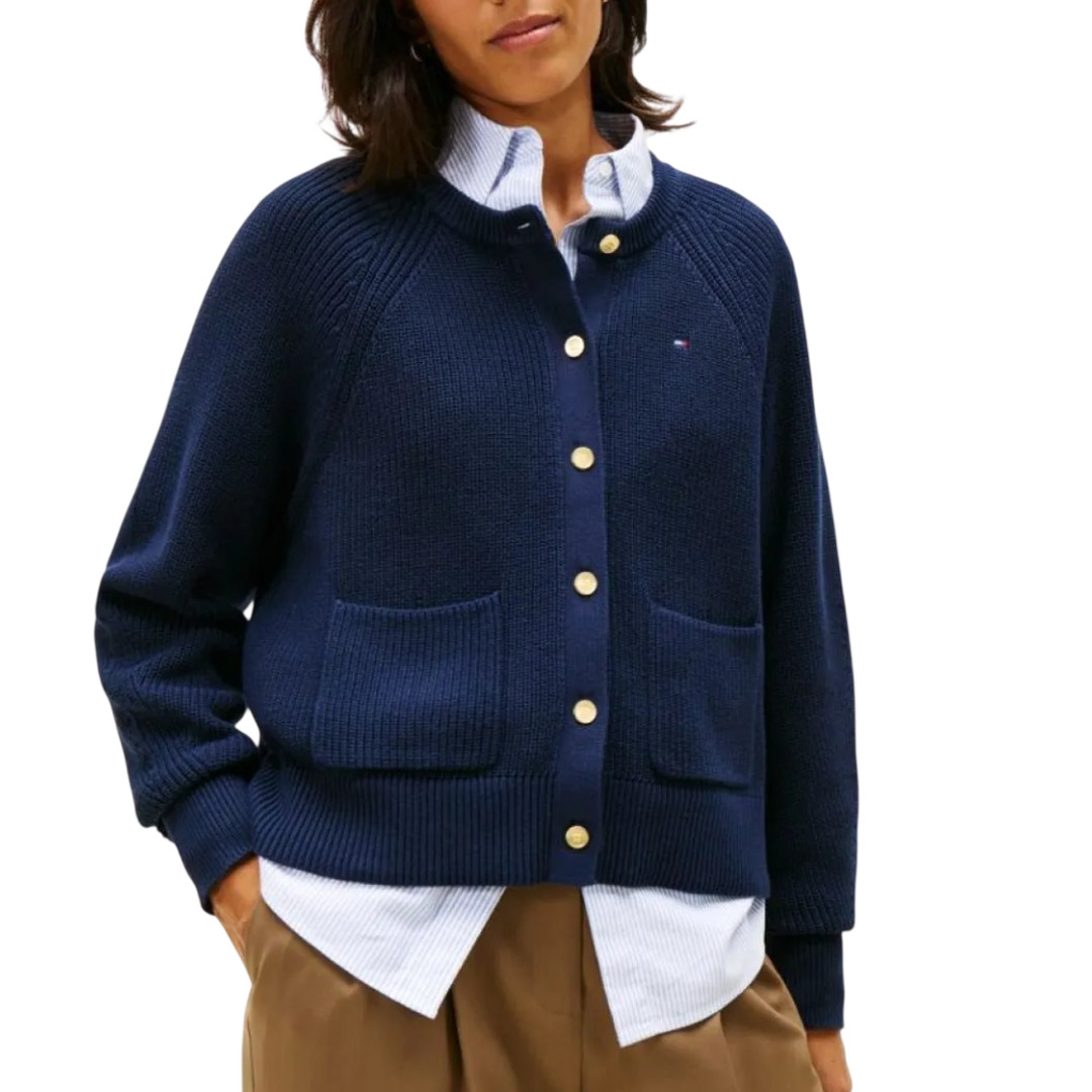 Il cardigan in maglia grossa, realizzato in puro cotone pettinato, è un capo intramontabile impreziosito dai luccicanti bottoni dorati con logo. Caratteristiche principali • Puro cotone pettinato • Punto costa inglese • Bottoni dorati • Girocollo • Chiusura con bottoni • Collo, abbottonatura, polsini e fondo a coste • Due tasche applicate sul davanti • Branding Tommy Hilfiger • Bandierina Tommy Hilfiger incisa sui bottoni • Bandierina Tommy Hilfiger ricamata sul petto Modello e vestibilità • Relaxed fit • Maniche raglan