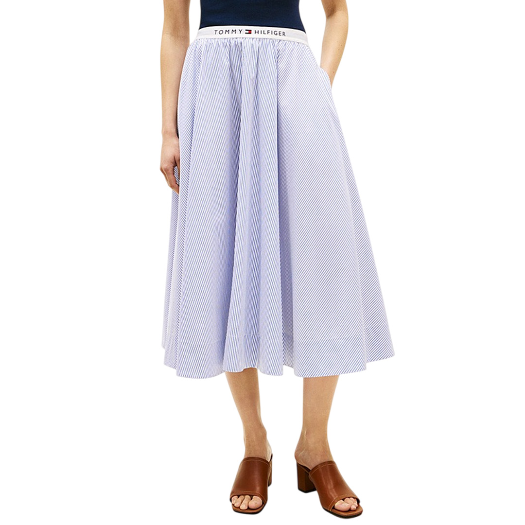 La gonna midi in puro cotone, con classica silhouette a trapezio, presenta l'elastico in vita sportivo con logo che aggiunge un tocco moderno. • Popeline di puro cotone • Pieghe all over • Due tasche laterali aperte • Elastico in vita con logo Tommy Hilfiger • Branding Tommy Hilfiger • Bandierina Tommy Hilfiger ricamata sul fondo