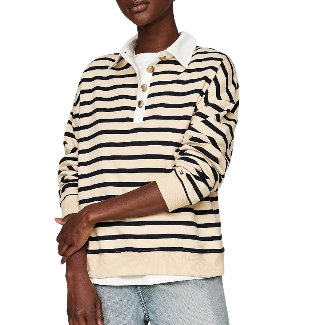 La felpa in stile polo, ispirata alla classica estetica college, si fa notare per l'elegante motivo a righe e i bottoni dorati decorati dallo stemma TH in rilievo. Caratteristiche principali • Puro cotone • Tinta in filo • Righe orizzontali all over • Colletto polo a contrasto • Chiusura a quattro bottoni • Fondo e polsini a coste • Stemma TH in rilievo sui bottoni dorati • Branding Tommy Hilfiger • Bandierina Tommy Hilfiger ricamata sul polsino Modello e vestibilità • Relaxed fit