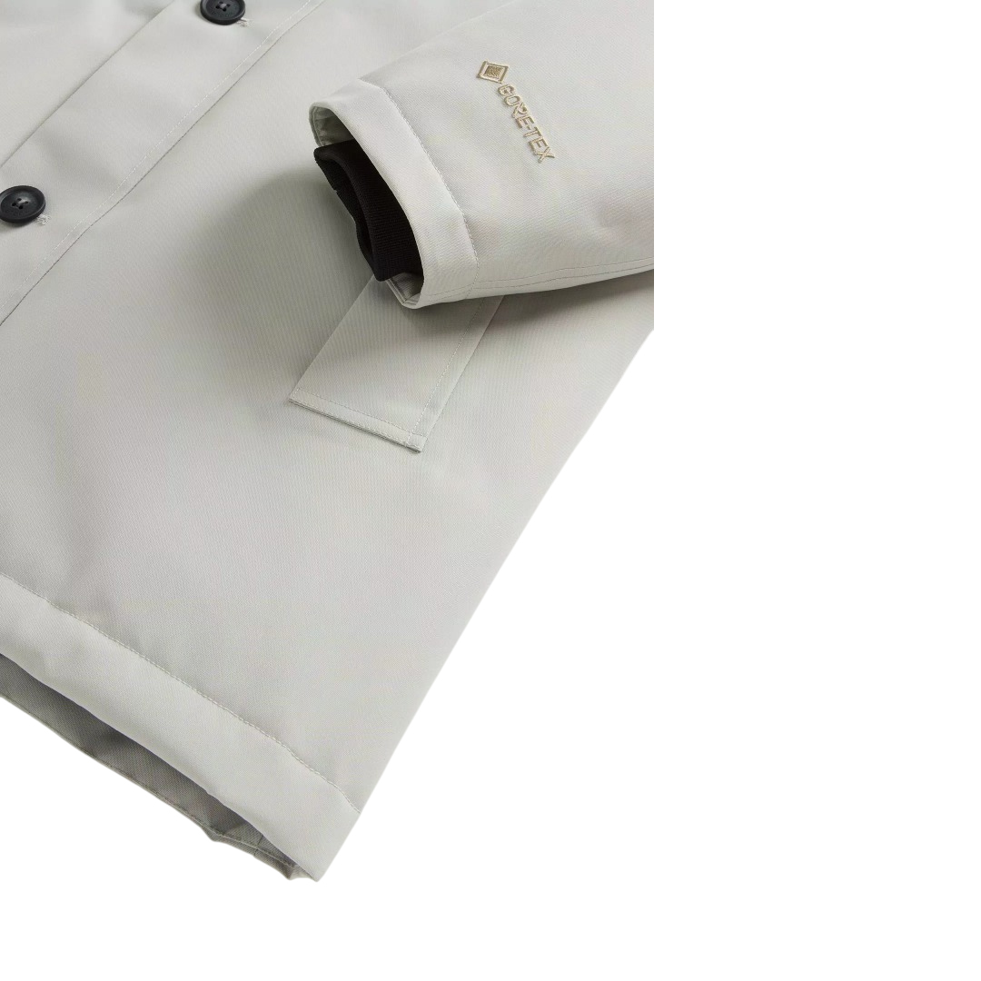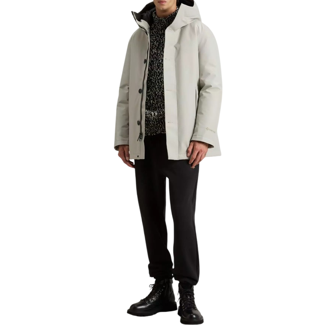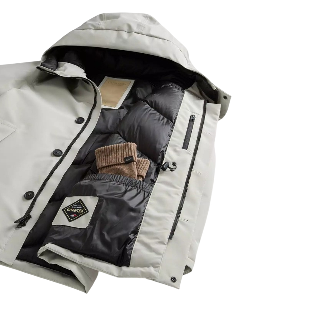 Realizzato in tessuto a 2 strati riciclato GORE-TEX, questo parka è il capospalla perfetto per affrontare la stagione fredda senza pensieri. È antivento, traspirante e impermeabile grazie alla presenza di cuciture interamente nastrate. L’imbottitura in piuma d’anatra garantisce calore e morbidezza, mentre la trapuntatura Chevron all’interno aggiunge un tocco distintivo. Presenta un cappuccio regolabile con visiera, una chiusura con cerniera bidirezionale e bottoni e polsini a costine. Completano il modello le tasche a filetto esterne e le tasche interne, due elasticizzate e una con zip. Realizzato in tessuto a 2 strati riciclato GORE-TEX Impermeabile, antivento e traspirante Cuciture interamente nastrate Imbottito in piuma d'anatra 90/10 RDS certificato da Control Union CU 884067 Trapuntatura Chevron interna Cappuccio regolabile sul retro con visiera Chiusura con zip bidirezionale e bottoni Coulisse interna in vita Tasche laterali a filetto Tasche interne elasticizzate Tasca interna con zip Polsini interni a costine Stampa GORE-TEX sulla manica Etichetta sul lato Scala di termicità: Freddo medio -10 °C / 0 °C