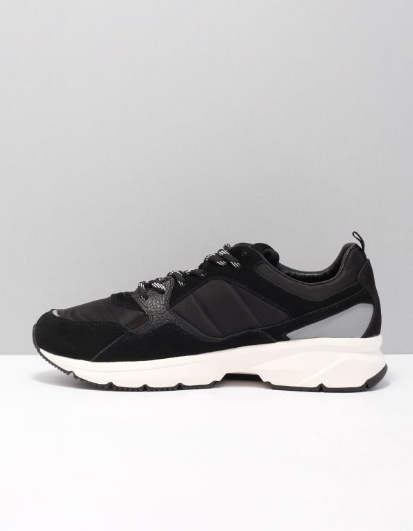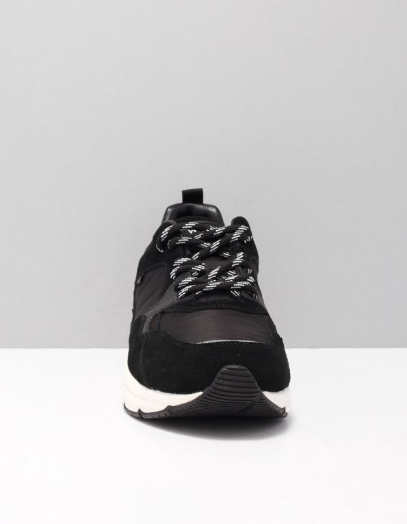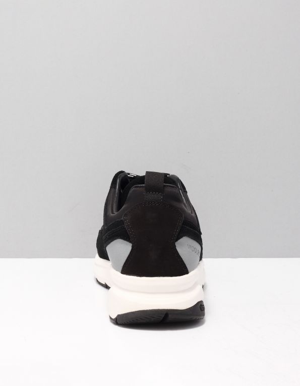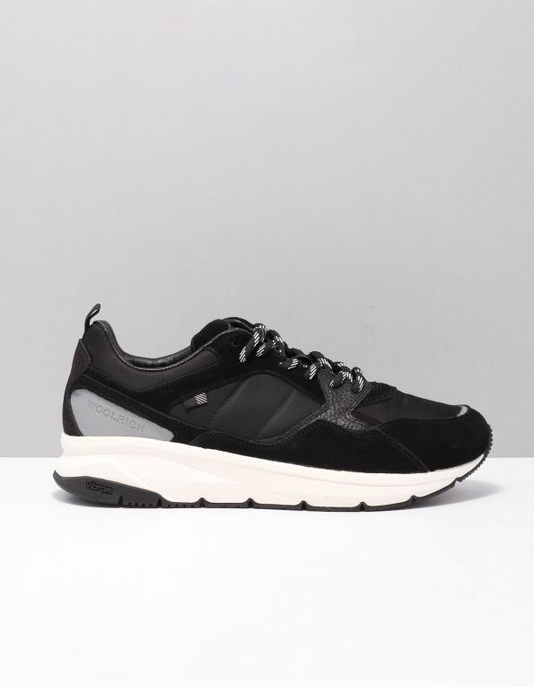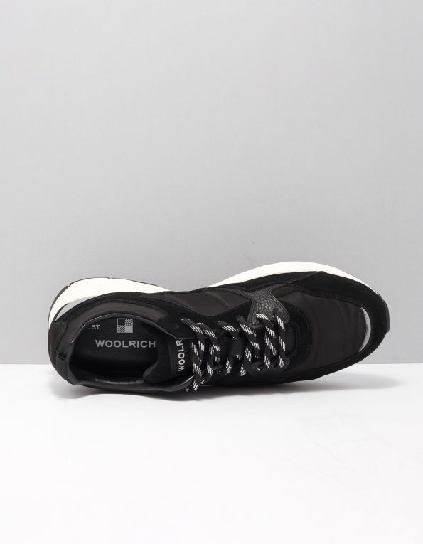 Sneaker con cuciture in pelle di Woolrich. Caratteristiche: punta tonda, allacciatura frontale, toppa con logo sulla linguetta, caviglia imbottita, inserto in pelle martellata, linguetta sul tallone, cuciture decorative e suola in gomma.